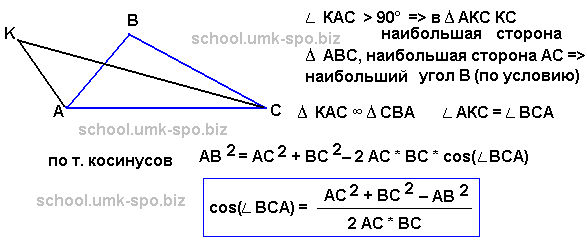 Задание Стороны AC, AB, BC треугольника ABC равны 2√2 , √5 и 1 соответственно. Точка K расположена вне треугольника ABC, причём отрезок KC пересекает сторону AB в точке, отличной от B. Известно, что треугольник с вершинами K, A и C подобен исходному. Найдите косинус угла AKC, если ∠KAC>90°.