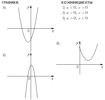 На рисунке изображены графики функций вида y=ax2+bx+c. Установите соответствие между графиками функций и знаками коэффициентов a и c.