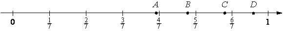 4/7 = 36/63 ⇒ точка 5/9 левее 4/7 ⇒ А