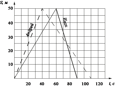 Андрей и Иван соревновались в 50-метровом бассейне на дистанции 100 м. Графики их заплывов показаны на рисунке. По горизонтальной оси отложено время в секундах, а по вертикальной — расстояние пловца от старта в метрах. Кто выиграл соревнование? В ответе запишите, на сколько секунд он обогнал соперника.