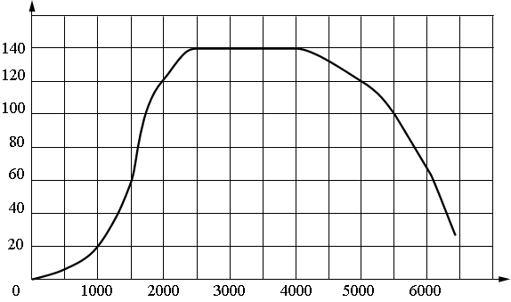 На графике изображена зависимость крутящего момента двигателя от числа его оборотов в минуту. На оси абсцисс откладывается число оборотов