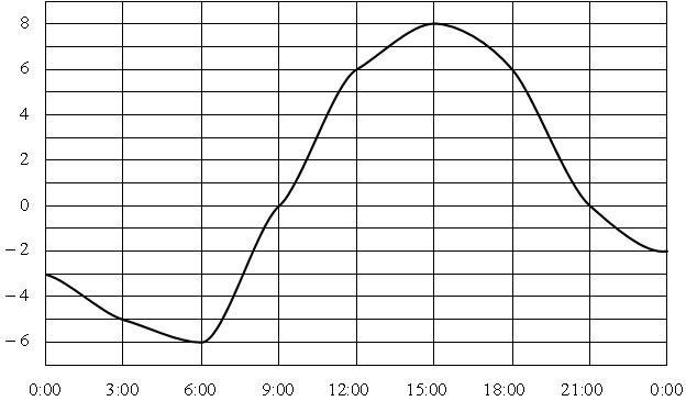 Задание На рисунке показано, как изменялась температура воздуха на протяжении одних суток. По горизонтали указано время суток, по вертикали — значение температуры в градусах Цельсия. Найдите наибольшее значение температуры в первой половине суток. Ответ дайте в градусах Цельсия.