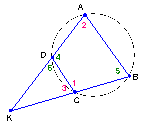 Известно, что около четырёхугольника ABCD можно описать окружность и что продолжения сторон AD и BC четырёхугольника пересекаются в точке K. Докажите, что треугольники KAB и KCD подобны.