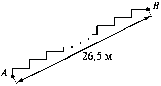 Лестница соединяет точки A и B. Высота каждой ступени равна 28 см, а длина — 45 см. Расстояние между точками A и B составляет 26,5 м. Найдите высоту, на которую поднимается лестница (в метрах).