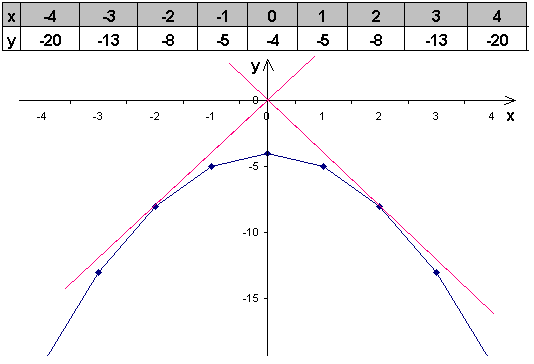 Найдите все значения k, при каждом из которых прямая y=kx имеет с графиком функции y=−x2−4 ровно одну общую точку. Постройте этот график и все такие прямые.
