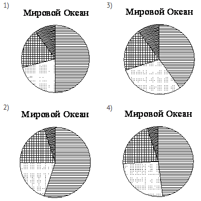 Задание Какая из следующих круговых диаграмм показывает распределение площадей океанов в Мировом Океане, если Тихий Океан занимает около 49% всего Мирового Океана, Атлантический — 26%, Индийский — 21% и Северный Ледовитый — 4%?