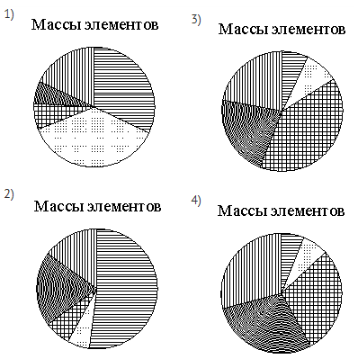 Задание Какая из следующих круговых диаграмм показывает распределение масс элементов в молекуле метионина, если масса водорода составляет 7% всей массы, азота — 9%, углерода — 40%, кислорода — 22% и серы — 22%?