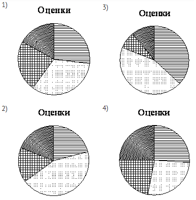 Какая из следующих круговых диаграмм показывает распределение оценок по контрольной работе по математике в 9 классе, если пятёрок в классе примерно 27% всех оценок, четвёрок — примерно 33%, троек — примерно 23% и двоек — примерно 17%?