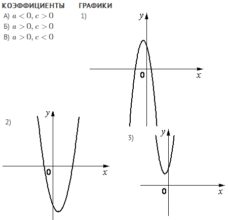 Ответ: - 130.6 Задание На рисунке изображены графики функций вида y=ax2+bx+c. Установите соответствие между знаками коэффициентов a и c и графиками функций.