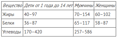 В таблице даны рекомендуемые суточные нормы потребления (в г/сутки) жиров, белков и углеводов детьми от 1 года до 14 лет и взрослыми.