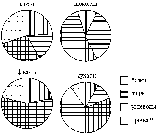 Задание На диаграмме показано содержание питательных веществ в какао, молочном шоколаде, фасоли и сливочных сухарях. Определите по диаграмме, в каком продукте содержание углеводов наибольшее.