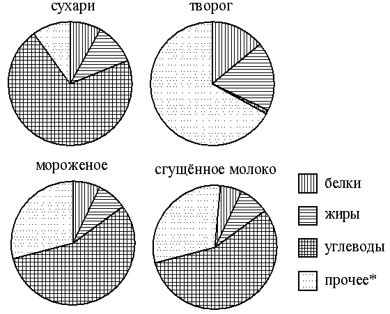 На диаграмме показано содержание питательных веществ в сливочных сухарях, твороге, сливочном мороженом и сгущённом молоке. Определите