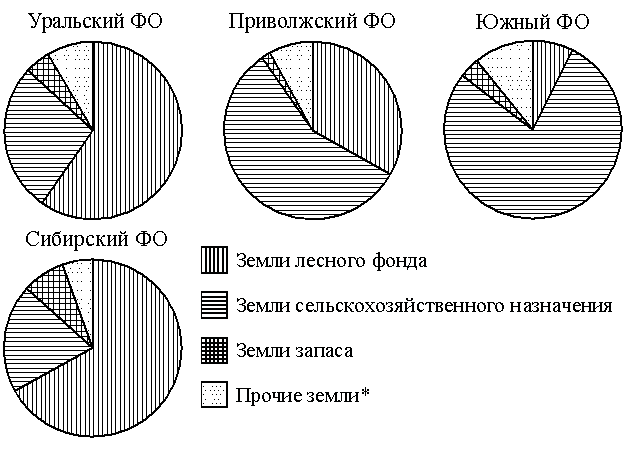 Задание На диаграмме показано распределение земель Уральского, Приволжского, Южного и Сибирского федеральных округов по категориям. Определите
