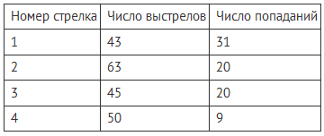 В таблице представлены результаты четырёх стрелков, показанные ими на тренировке.