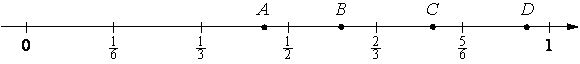1/3 = 2/6 = 22/66 ⇒ точка 5/11 левее 1/2 и правее 1/3 ⇒ А