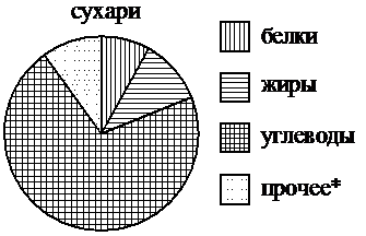Задание На диаграмме показано содержание питательных веществ в сливочных сухарях. Определите по диаграмме, содержание каких веществ преобладает.
