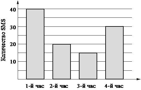 На диаграмме показано количество SMS, присланных слушателями за каждый час четырёхчасового эфира программы по заявкам на радио. Определите, на сколько больше сообщений было прислано за первые два часа программы по сравнению с последними двумя часами этой программы.
