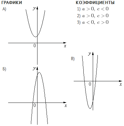 Задание На рисунке изображены графики функций вида y=ax2+bx+c. Установите соответствие между графиками функций и знаками коэффициентов a и c.