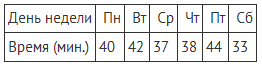 Василий измерял в течение недели время, которое он тратил на дорогу до школы, а результаты записывал в таблицу.