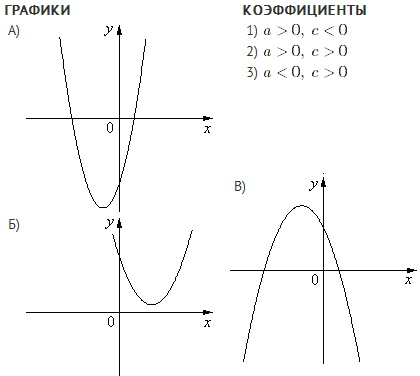На рисунке изображены графики функций вида y=ax2+bx+c. Установите соответствие между графиками функций и знаками коэффициентов a и c.