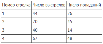 В таблице представлены результаты четырёх стрелков, показанные ими на тренировке.