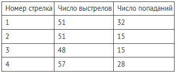 В таблице представлены результаты четырёх стрелков, показанные ими на тренировке.