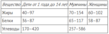 В таблице даны рекомендуемые суточные нормы потребления (в г/сутки) жиров, белков и углеводов детьми от 1 года до 14 лет и взрослыми.