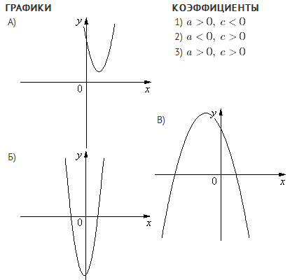 Задание На рисунке изображены графики функций вида y=ax2+bx+c. Установите соответствие между графиками функций и знаками коэффициентов a и c.
