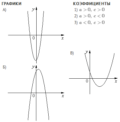 Задание На рисунке изображены графики функций вида y=ax2+bx+c. Установите соответствие между графиками функций и знаками коэффициентов a и c.