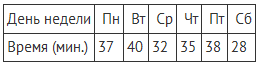 Василий измерял в течение недели время, которое он тратил на дорогу до школы, а результаты записывал в таблицу.
