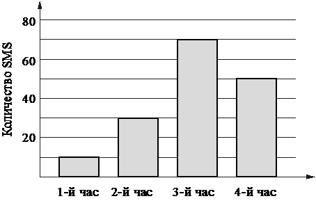 Задание На диаграмме показано количество SMS, присланных слушателями за каждый час четырёхчасового эфира программы по заявкам на радио. Определите, на сколько больше сообщений было прислано за последние два часа программы по сравнению с первыми двумя часами этой программы.