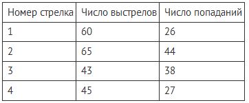 В таблице представлены результаты четырёх стрелков, показанные ими на тренировке.