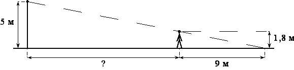 Задание На каком расстоянии (в метрах) от фонаря стоит человек ростом 1,8 м, если длина его тени равна 9 м, высота фонаря 5 м?