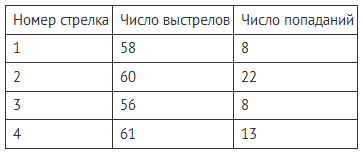 В таблице представлены результаты четырёх стрелков, показанные ими на тренировке.