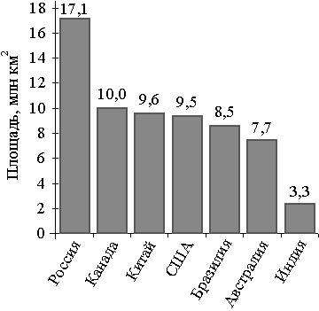 На диаграмме представлены семь крупнейших по площади территории (в млн км2) стран мира.