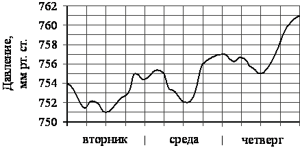 На рисунке изображён график изменения атмосферного давления в некотором городе за три дня. По горизонтали указаны дни недели, по вертикали — значения атмосферного давления в миллиметрах ртутного столба. Укажите наименьшее значение атмосферного давления за данные три дня (в мм рт. ст.).