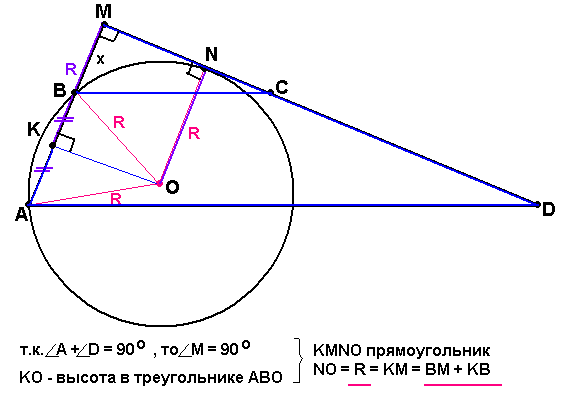 В трапеции ABCD основания AD и BC равны соответственно 30 и 10, а сумма углов при основании AD равна 90∘. Найдите радиус окружности, проходящей через точки A и B и касающейся прямой CD, если AB=13.