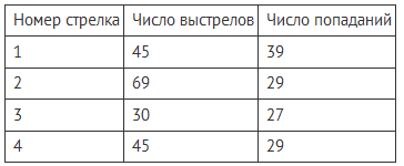 Задание В таблице представлены результаты четырёх стрелков, показанные ими на тренировке.