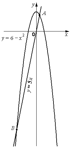 На рисунке изображены графики функций y=6−x2 и y=5x. Вычислите абсциссу точки B.
