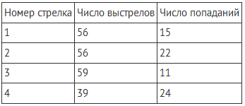 В таблице представлены результаты четырёх стрелков, показанные ими на тренировке.