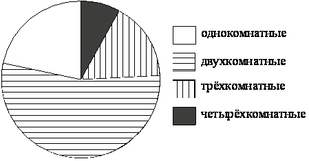 В доме располагаются однокомнатные, двухкомнатные, трёхкомнатные и четырёхкомнатные квартиры. Данные о количестве квартир представлены на круговой диаграмме.