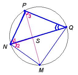 В выпуклом четырёхугольнике NPQM диагональ NQ является биссектрисой угла PNM и пересекается с диагональю PM в точке S. Найдите NS, если известно, что около четырёхугольника NPQM можно описать окружность, PQ=85, SQ=17.