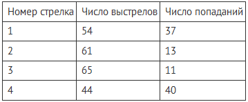 В таблице представлены результаты четырёх стрелков, показанные ими на тренировке.