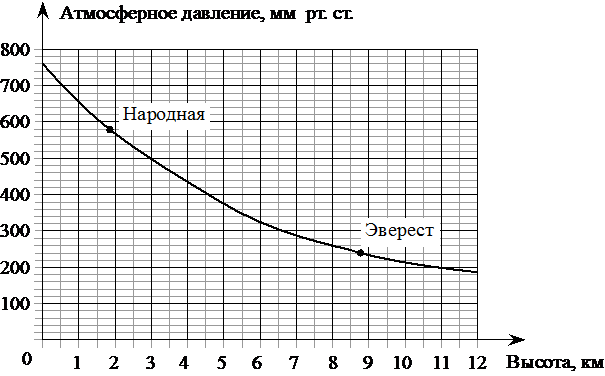 На графике изображена зависимость атмосферного давления от высоты местности над уровнем моря. По горизонтали указана высота над уровнем моря в километрах, по вертикали — атмосферное давление в миллиметрах ртутного столба. На сколько миллиметров ртутного столба атмосферное давление на высоте Эвереста ниже атмосферного давления на высоте Народной?