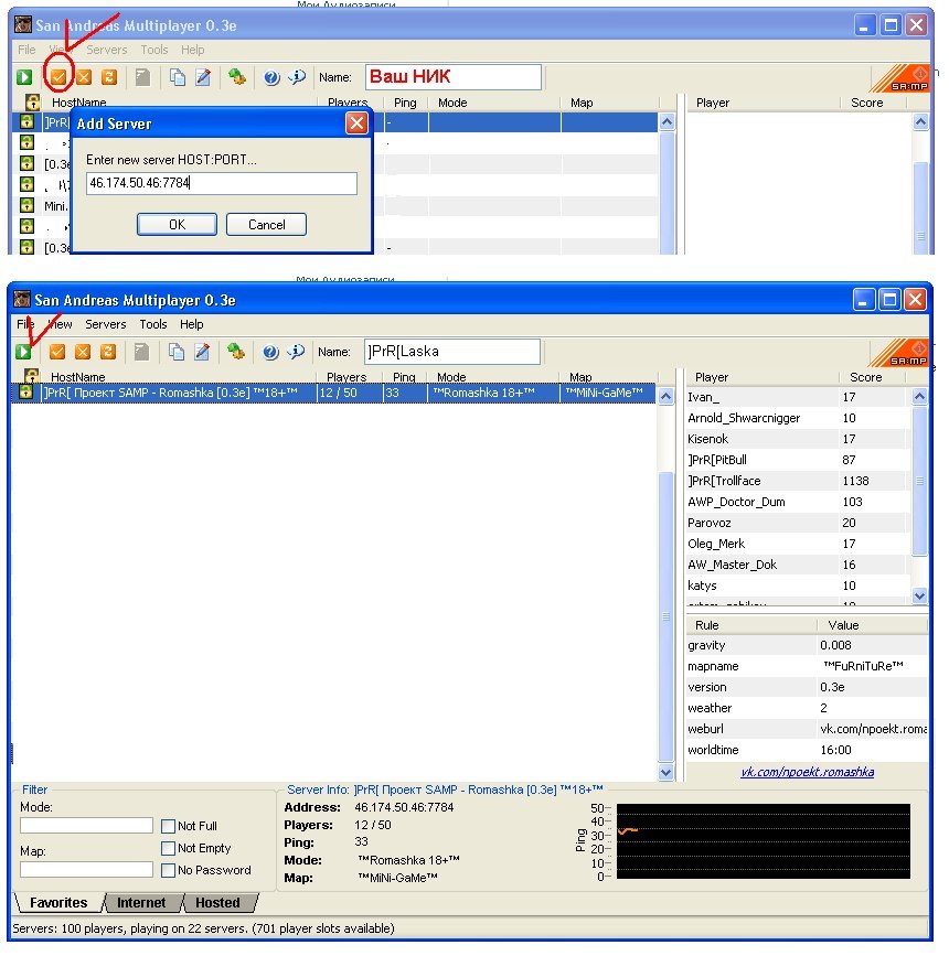 • После запуска Multiplayer записываете свой ник (EN - раскладка) находите сервер 46.174.50.46:7784 .